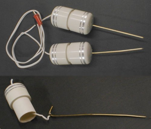 The other belt-mount unit is called a "Magnetic Wave Guide Receiver". Like the AQC, it has a 1/8" headphone jack that the rods plug into; it also has a momentary push-button switch and an LED. When you push the switch, the LED turns on. The inside of the Magnetic Wave Guide Receiver is shown in Fig. 9. Besides lighting the LED, the only thing the switch does is short the dowsing rods together. If you touch the dowsing rods together, the LED also turns on. I'm not sure why the user of the VR-800 needs a battery powered box to short the rods together, or why he would need an LED to tell him that the rods are shorted. A final interesting feature of this unit is the bar magnet that is glued inside the box. It is not connected to anything, or seemingly used for anything, just sitting there. There are no advertising claims I've been able to find on this accessory, so I cannot comment on what it's supposed to do, other than to say it doesn't do much. The remaining pieces of the VR-800 are the ground probes and the dowsing rods, as well as a carrying case. The ground probes are shown in Fig. 10, along with one disassembled. They are made of common PVC pipe fittings and 1/4 brass rods. It is obvious that the quality of construction is extremely poor and can easily be exceeded by any reasonably competent handyman. The dowsing rods are shown in Fig. 11 with an inset showing details of the inside of the handle; these are made from common copper pipe and fittings, plus 1/4" brass rods. Again, poor quality is evident and better rods can easily be made for very little money. |