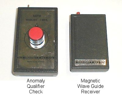 The advertising claims that the AQC is used to null out weak target signals, thereby eliminating "micron-sized" (invisible) gold particles. It says it can also be used to determine the size of a target, by progressively turning the knob until the rods cease to respond. The adjustment knob is only calibrated as "Ounces" and "Pounds" so I'm not sure know how you would read the position. The Weight Chek manual has some other interesting claims. It says "Weight Chek cycles 92 of the commonly used frequencies within the KHZ range then senses and locks on to the frequency used by the MFD." This is entirely false - the unit outputs a pulse whose frequency is set by the user; it does not "cycle 92 frequencies," it does not sense anything the MFD is doing, and it does not lock on to the MFD transmit frequency. |