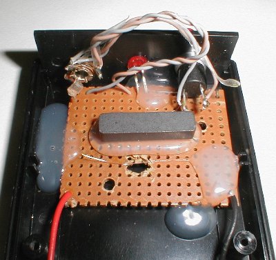 The inside of the transmit box is shown in Fig. 3, with the inside of the front panel in Fig. 4. Besides the switches and LED's on the front panel there is a hand-wired circuit board glued to the bottom half of the box, shown in Fig. 5. The circuit board used is known as "perf board", a type normally used for prototyping circuits and commonly available at Radio Shack. The circuitry is a "555" timer chip wired as a pulse oscillator with 6 trim potentiometers that set the frequency, depending on which is switched in by the front panel switch. A complete schematic is shown in Fig. 6 - the unmarked potentiometers are 100k that are adjusted to achieve the final frequencies. |